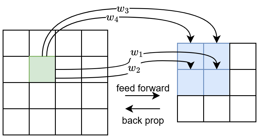 A few more words on convolutional layer. First, $$ \text{\# of parameters}=(\text{\# of input channels}\times\text{kernel size}^2+1)\times\text{\# of output channels} $$ Second, we have stride and padding for convolutional layer. If the original size of some dimension is $n$, then the output size is $$ \left\lfloor\frac{n+\text{padding}-\text{kernel}}{\text{stride}}\right\rfloor+1 $$ On backpropagation of convolutional layer, we first write convolution as, like $$ z^{(l+1,\cdot)}\gets\mat{ w_1&w_2&0&w_3&w_4&0&0&0&0\\ 0&w_1&w_2&0&w_3&w_4&0&0&0\\ 0&0&0&w_1&w_2&0&w_3&w_4&0\\ 0&0&0&0&w_1&w_2&0&w_3&w_4\\ }z^{(l,\cdot)}+\mat{b\\b\\b\\b} $$ where $W=\mat{w_1&w_2\\w_3&w_4}$ is the kernel. Since we know that, for $\b z_{l+1}=W_l\b z_l+\b b_l$, $$ \nabla_{\b z_l}\ell=\left(\frac{\p\ell}{\p\b z_l}\right)^\top=\left(\frac{\p\ell}{\p\b z_{l+1}}W_l\right)^\top=W_l^\top\nabla_{\b z_{l+1}}\ell $$ so, examine $$ \begin{align*} g^{(l,\cdot)}&=\mat{w_1&0&0&0\\ w_2&w_1&0&0\\ 0&w_2&0&0\\ w_3&0&w_1&0\\ w_4&w_3&w_2&w_1\\ 0&w_4&0&w_2\\ 0&0&w_3&0\\0&0&w_4&w_3\\ 0&0&0&w_4}g^{(l+1,\cdot)}\\ &= \mat{ w_4&w_3&0&0&w_2&w_1&0&0&0&0&0&0&0&0&0&0\\ 0&w_4&w_3&0&0&w_2&w_1&0&0&0&0&0&0&0&0&0\\ 0&0&w_4&w_3&0&0&w_2&w_1&0&0&0&0&0&0&0&0\\ 0&0&0&0&w_4&w_3&0&0&w_2&w_1&0&0&0&0&0&0\\ 0&0&0&0&0&w_4&w_3&0&0&w_2&w_1&0&0&0&0&0\\ 0&0&0&0&0&0&w_4&w_3&0&0&w_2&w_1&0&0&0&0\\ 0&0&0&0&0&0&0&0&w_4&w_3&0&0&w_2&w_1&0&0\\ 0&0&0&0&0&0&0&0&0&w_4&w_3&0&0&w_2&w_1&0\\ 0&0&0&0&0&0&0&0&0&0&w_4&w_3&0&0&w_2&w_1\\ }\mat{0\\0\\0\\0\\0\\ g^{(l+1,\cdot)}_1\\ g^{(l+1,\cdot)}_2\\0\\0\\ g^{(l+1,\cdot)}_3\\ g^{(l+1,\cdot)}_4\\0\\0\\0\\0\\0} \end{align*} $$ so we find that, backpropagation through the convolution layer is just convolution by flipped filter after padding.
