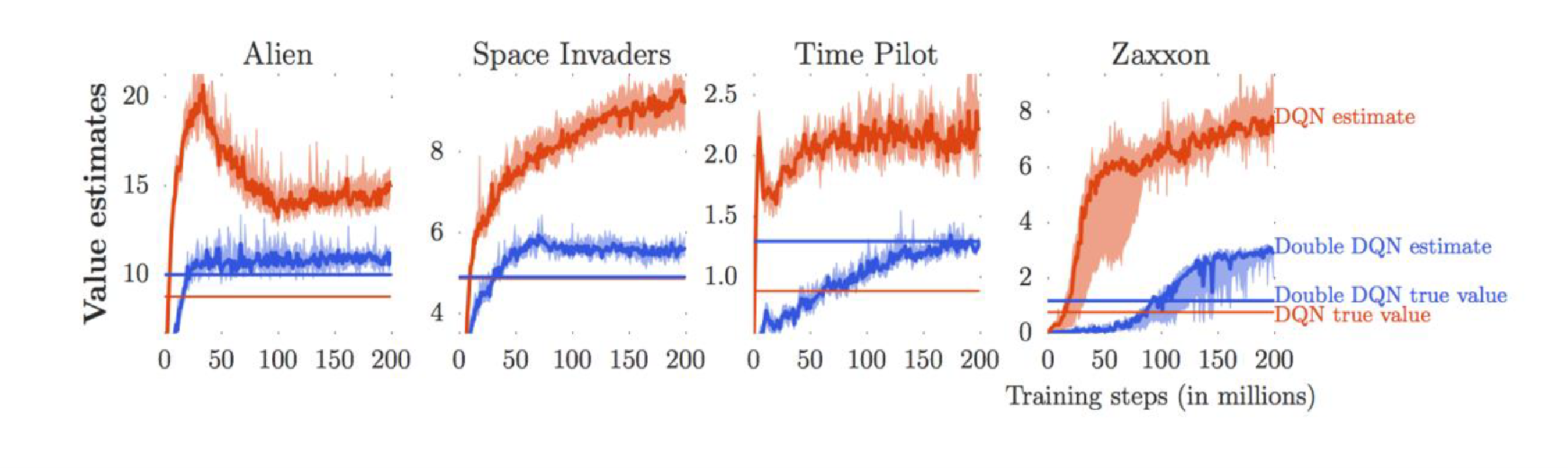 This plot shows that double DQN is less biased and has lower variance. Note that the “true value” is $\E(\sum\gamma^tr_t)$ when following the policy yielded by $\argmax$.