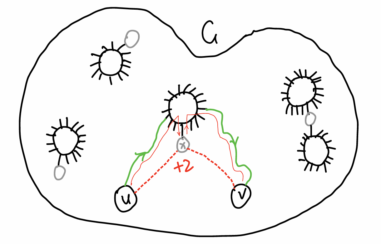(情况 1)如果 $\pi(u,v)$ 有束间点 $x$,那么 $d(u,x),d(x,v)$ 中至少有一个 $\le d(u,v)/2$,不妨设为 $d(u,x)$,则 $$ d(u,p(u))+d(p(u),v)\le 2d(u,p(u))+d(u,v)\le 2d(u,x)+d(u,v)\le 2d(u,v)\tag{1} $$ 剩余的情况(情况 2)是关注的重点。