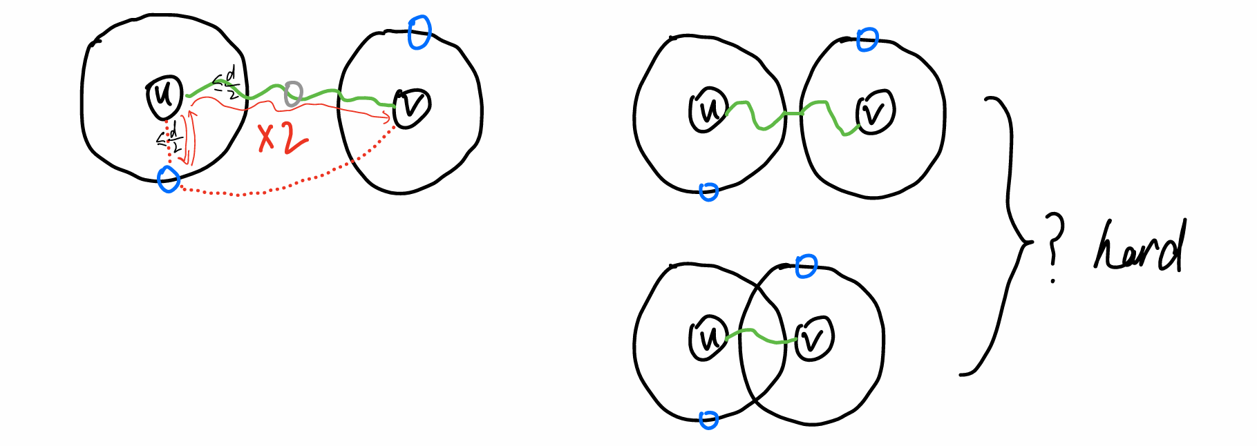 - 通过一个中介点 $x$,三角不等式放缩多出两倍的 $d(x,?)$(在无权图中就是 $+2$),得到 $2$(或 $2+\epsilon$) 近似。