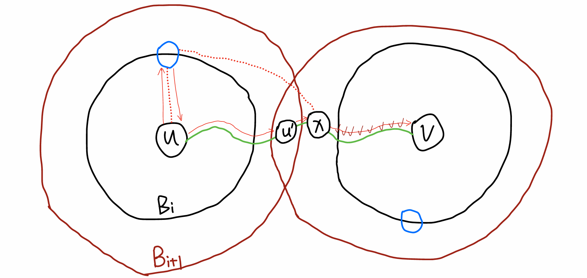 建立这样的图:$p_i(u)$ 向所有与 $B_{i+1}(u)$ 相邻的点(及上述 $x$ 这样的点)连边,边权 $$ \delta^\prime(p_i(u),x)=\min_{u^\prime}\set{d(p_i(u),u)+d(u,u^\prime)+w(u^\prime,x)} $$ 另外对于所有的点 $v$,将与 $v$ 相邻的权 $\le d(v,p_{i+1}(v))$ 的边加入。跑 Dijkstra。设 $\pi(x,v)=x\to\cdots\to v_1\to v$。由于 $x\in B_{i+1}(v)$,故 $(v_1,v)$ 是保留的;由于 $d(v_1,p_{i+1}(v_1))+w(v_1,v)\ge d(v,p_i(v))$,故 $x\in B_{i+1}(v_1)$,所以 $(v_2,v_1)$ 也保留,以此类推。